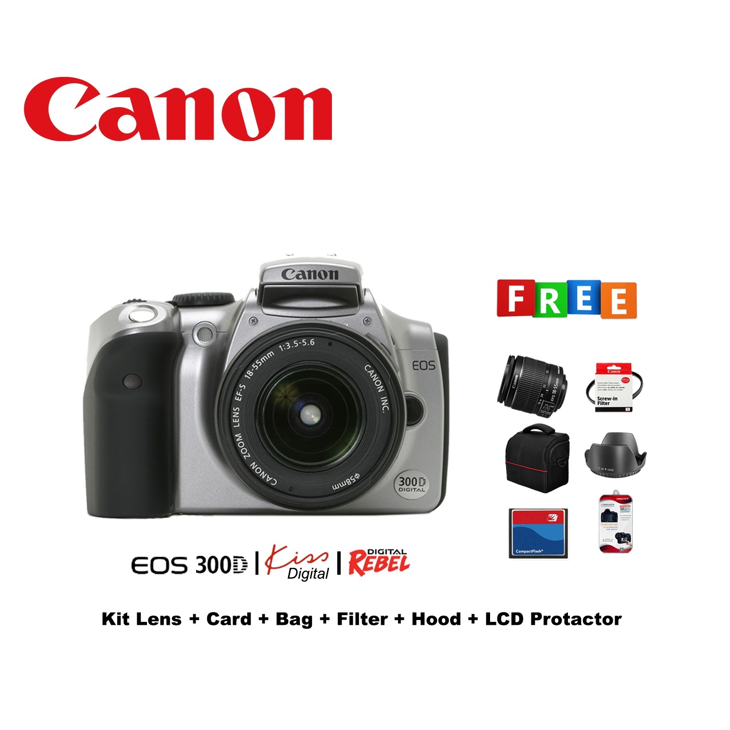 Canon EOS 300D | Kiss Digital | Rebel Digital Kit lens Card Bag Hood Protector Filter